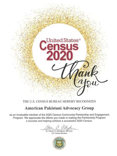 Appreciation from U.S. Census Bureau for American Pakistani Advocacy Group (APAG) Census 2020 outreach program.